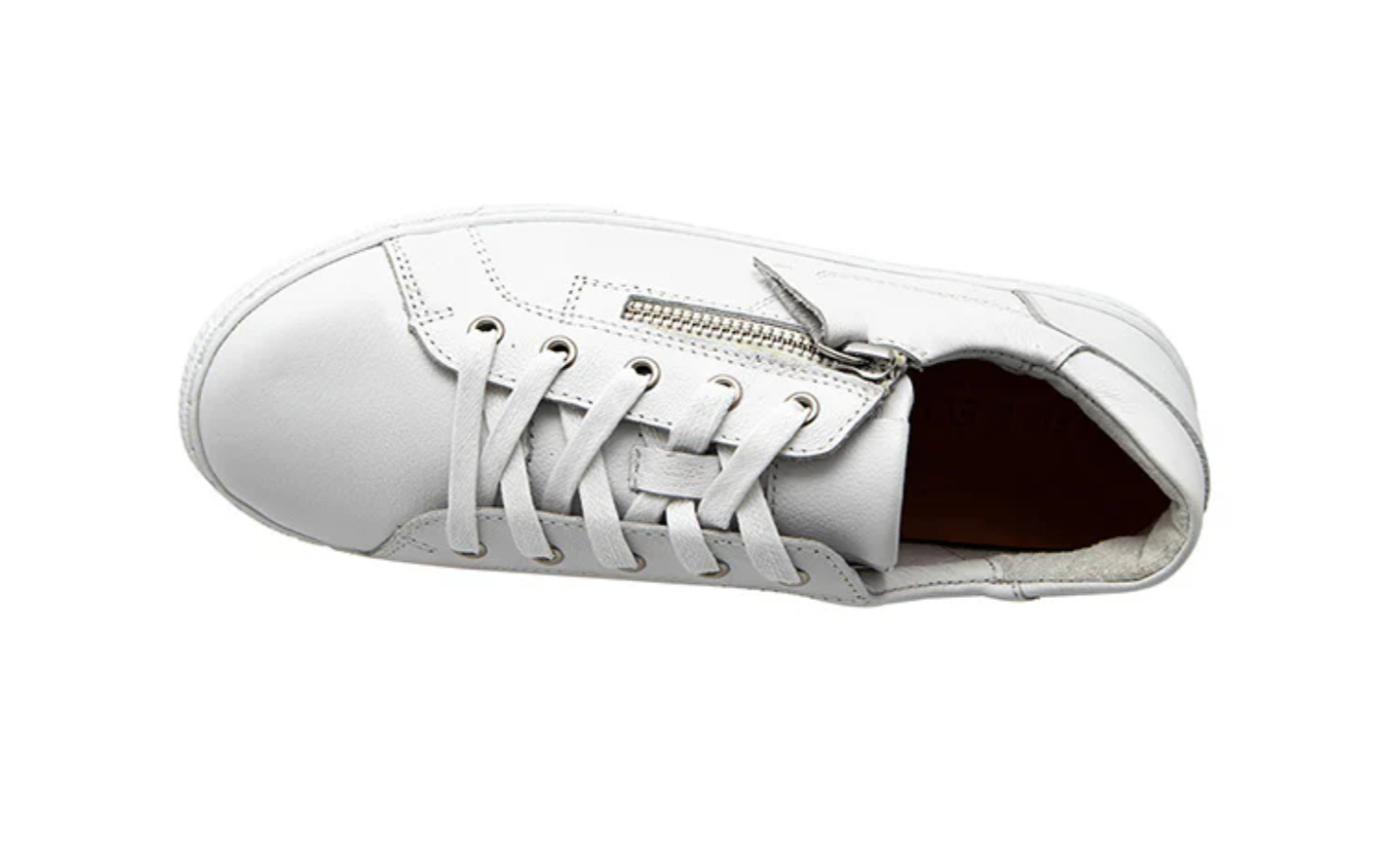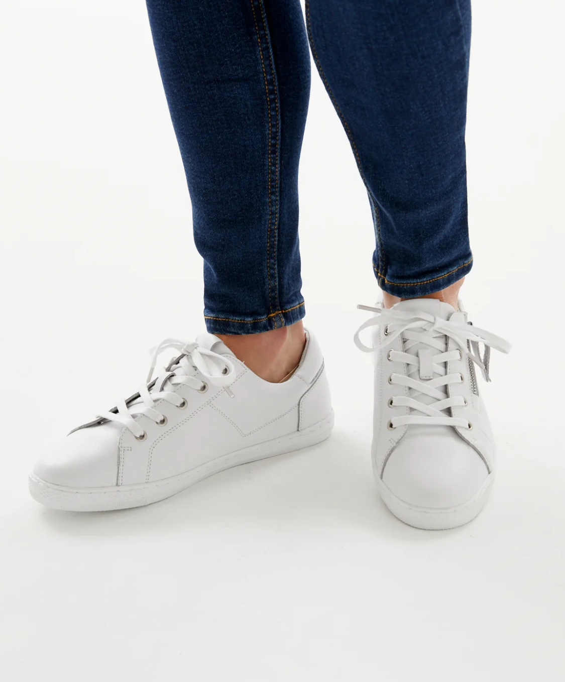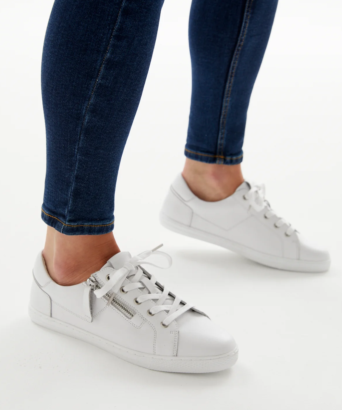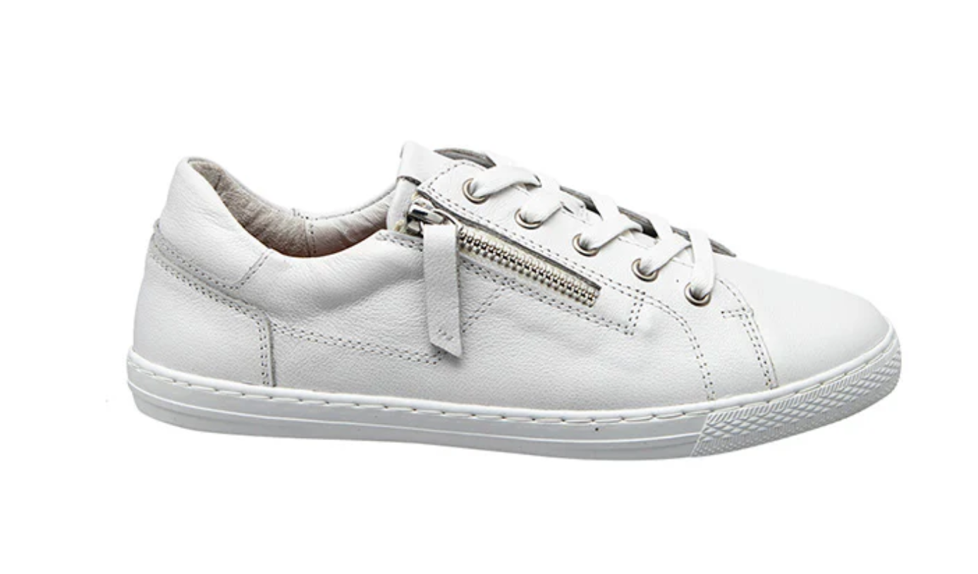 A low-profile slim line sneaker crafted on a light-weight rubber plimsole. Combining a sleek look and supportive structure in one. Featuring an inside zip laced upper in white soft leather, an arch support removable leather sock and padded heel counter.