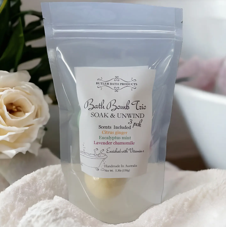 Our bath bomb trio will leave skin ultra soft and smelling delicious! Sit back, fizz, and relax! Each pack comes with 3 mini bath bombs. Scents include Citrus ginger, Eucalyptus mint and Lavender chamomile. Made with nourishing, skin-soothing, and hydrating ingredients like Epsom salt, Vitamin e, and shea butter. It's also infused with an essential oil blend to bring an aroma therapeutic experience to your bath time. 150g per pack (40g) per bath bomb Suggested use Prior to use, remove outer plastic wrap from each bath bomb. Add 1 bath bomb to warm bath water and enjoy! Australian made | Vegan Friendly | Cruelty free | Small batch