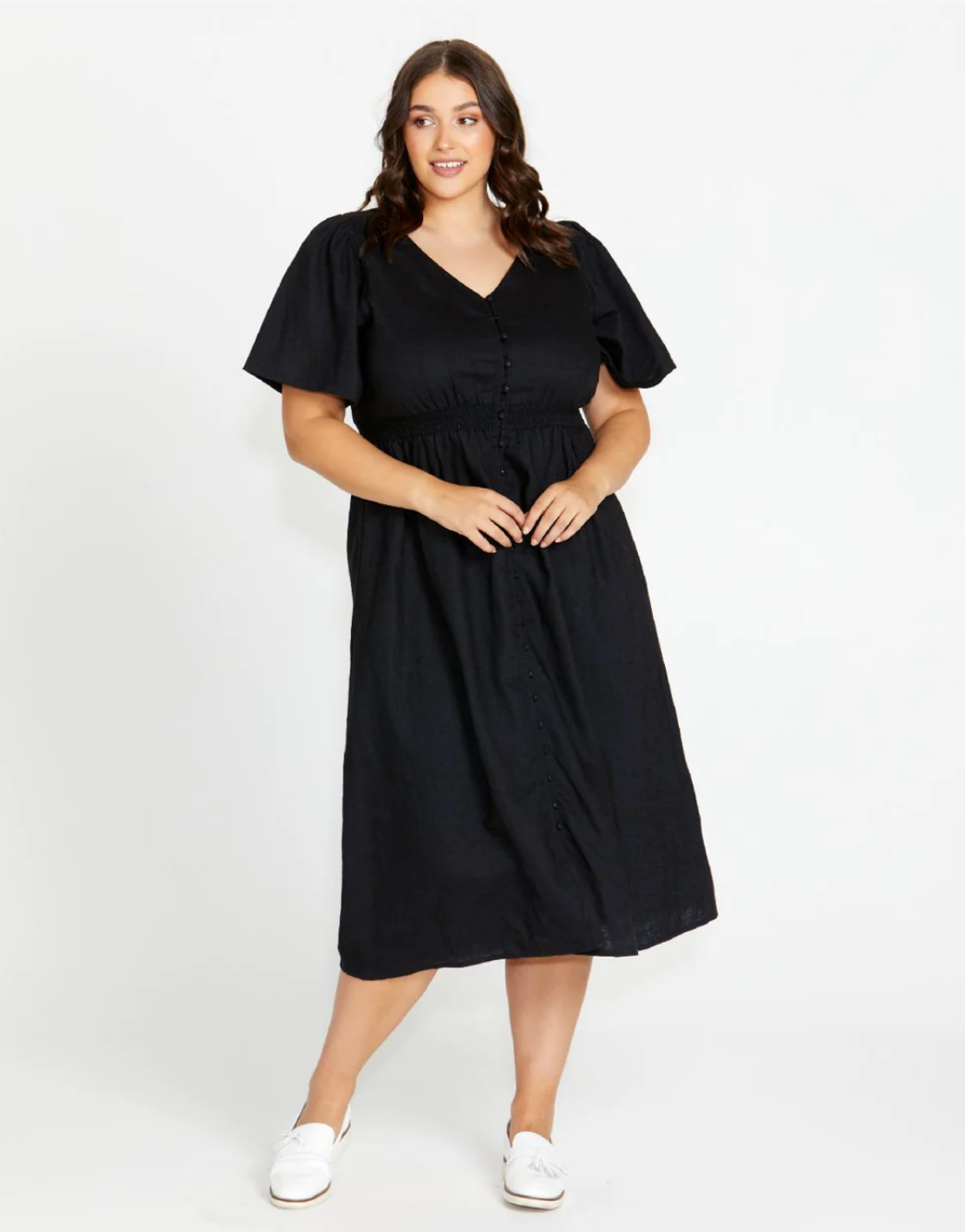Elevate your style effortlessly with the Whitney Dress! This midi-length beauty features a shirred empire waistline for a flattering fit that embraces comfort. The relaxed fluted sleeves add a touch of elegance to your look, while the V neckline with self-fabric button bodice adds a charming detail. Step into a world of fashion-forward relaxation with the Whitney Dress, where style meets ease in the most delightful way. Upgrade your wardrobe and embrace chic comfort today!