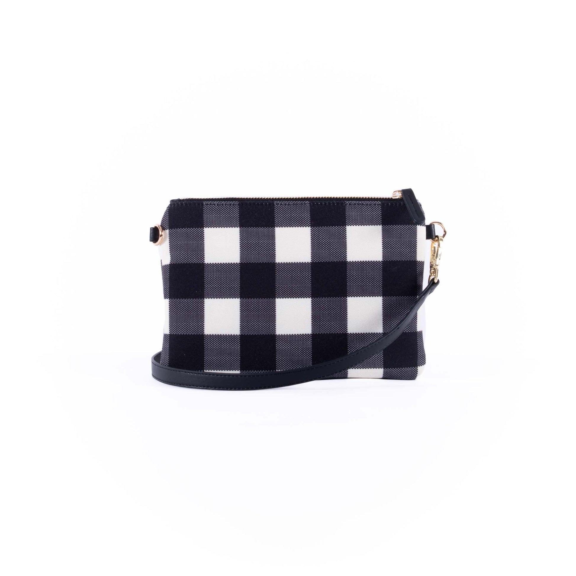 - External Features: Black & white gingham canvas, cross body strap & wristlet strap