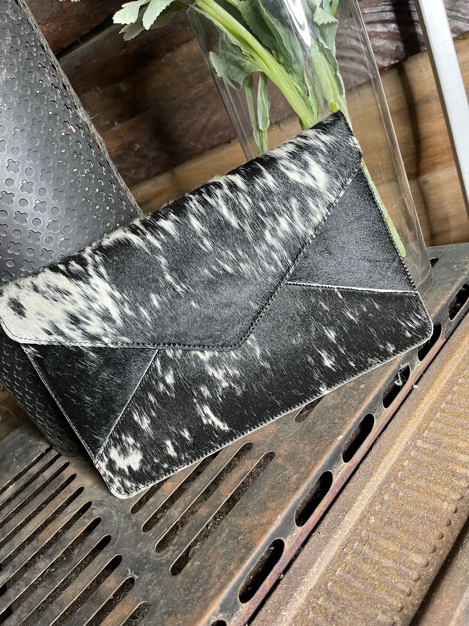 This stunning oversized hairon Envelope cowhide clutch is surely a showstopper. Easy to carry, this sleek all hairon style features enough room for use as an evening cowhide clutch that compliments any outfit.