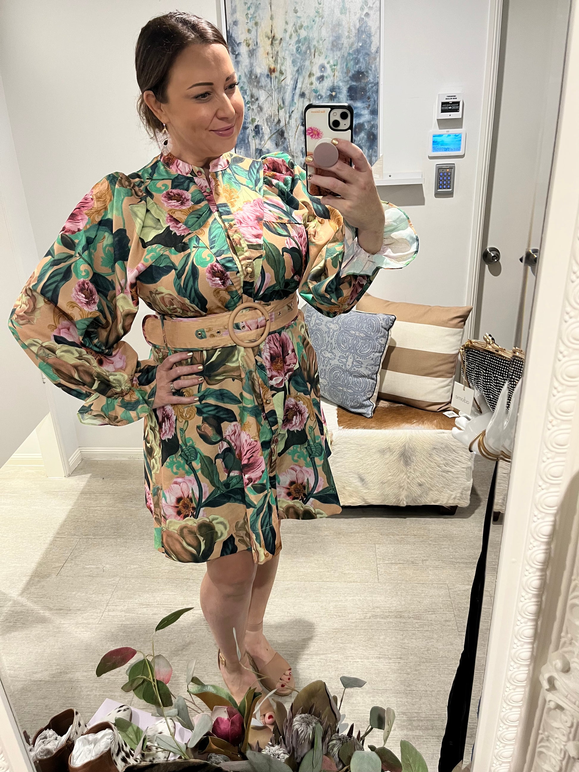 The ROSE  DONATELLA DRESS is stunning to say the least! It is an exclusive print in beautiful sand, pink and green tones, lined skirt and loose fit. Features a button down mini dress with classic Donatella belt, long sleeves with hidden elastic. Fluted cuffs, mandarin collar and oversized raglan sleeve.