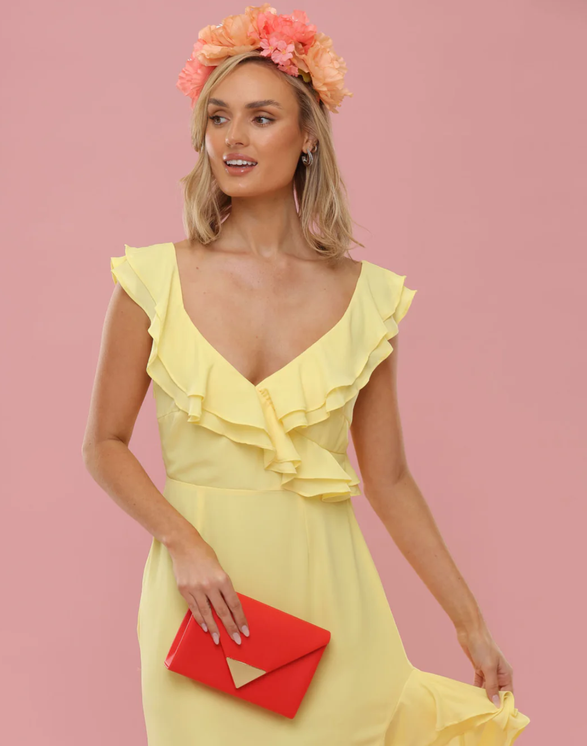 The Morgan and Taylor Eva Bag in Red is a structured, envelope clutch perfect for making an elegant statement.