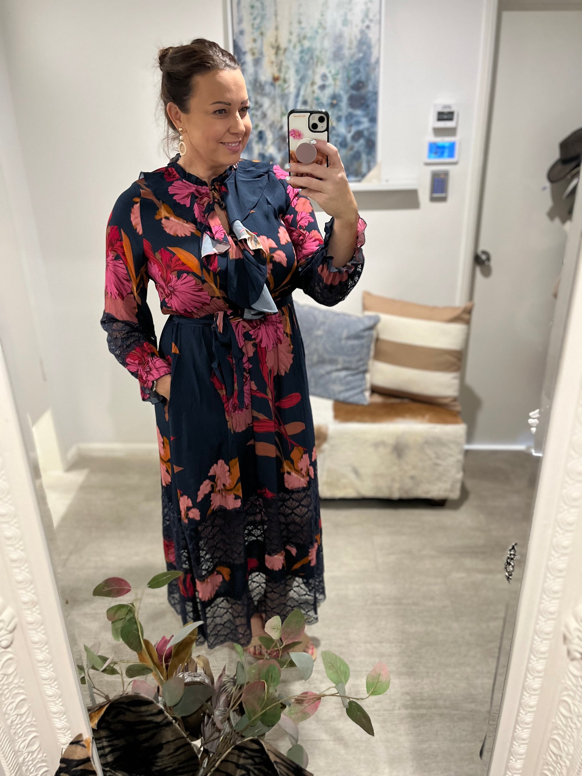 The Captivation Dress is a refined long sleeve dress designed for effortless elegance. Highlighted by ruffle neck detailing, lace panelling, and a unique print, it features a soft drapey fabrication and a regular fit. A transeasonal standout with timeless appeal.