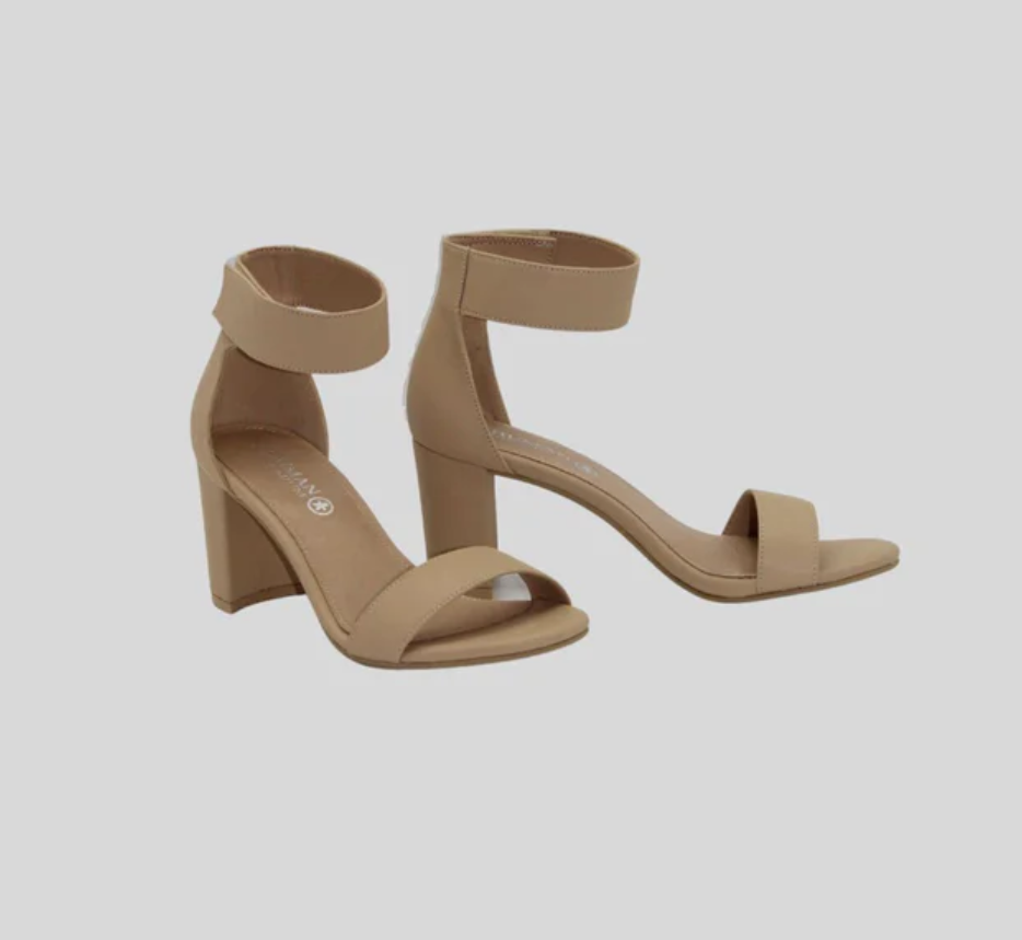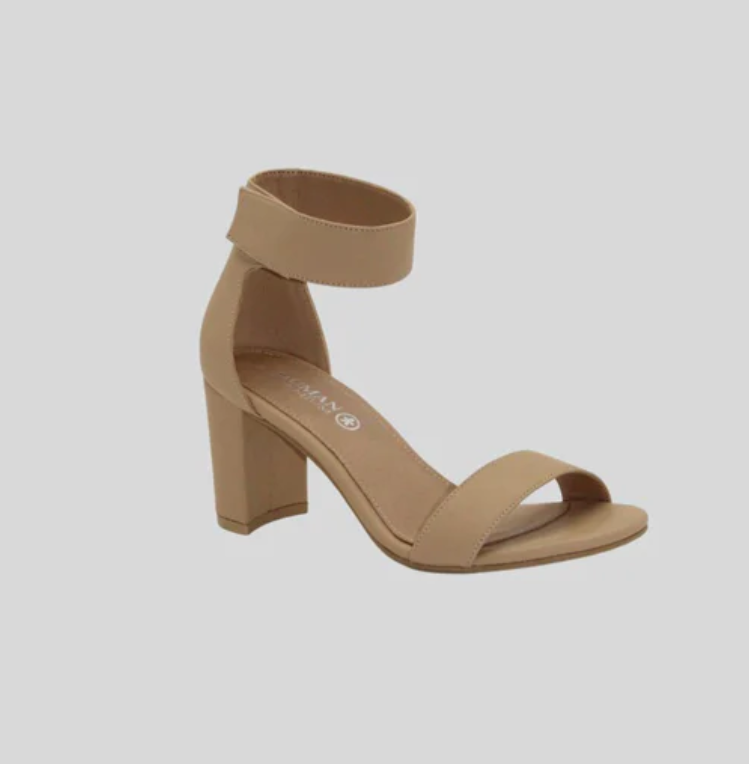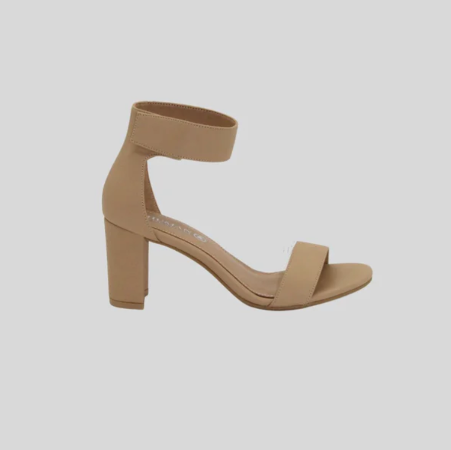 Simplistic leather sandal on a comfortable block heel with adjustable velcro ankle strap.