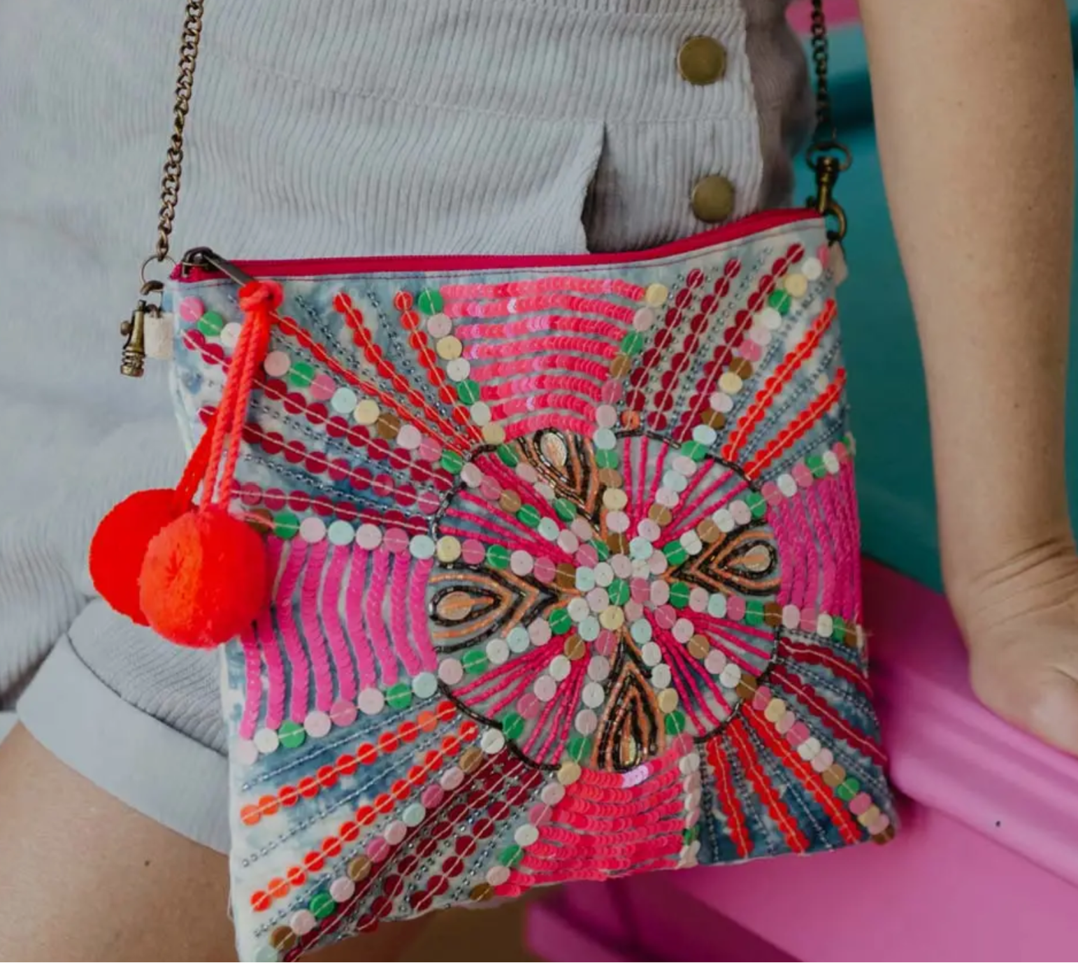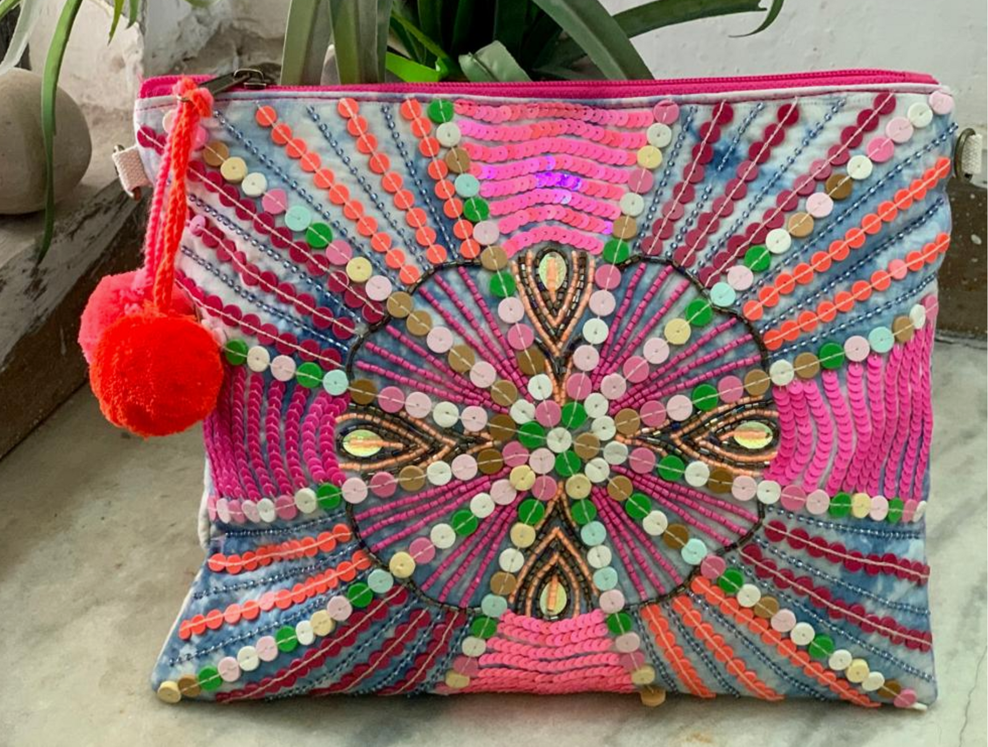 This clutch is perfect for a night out! It's cute, colorful, and embroidered, and it has an interior pocket to keep your things safe. The zipper closure keeps everything secure, and the optional crossbody chain means you can carry it hands-free. 10.75” x 9” interior pocket zipper closure optional crossbody chain