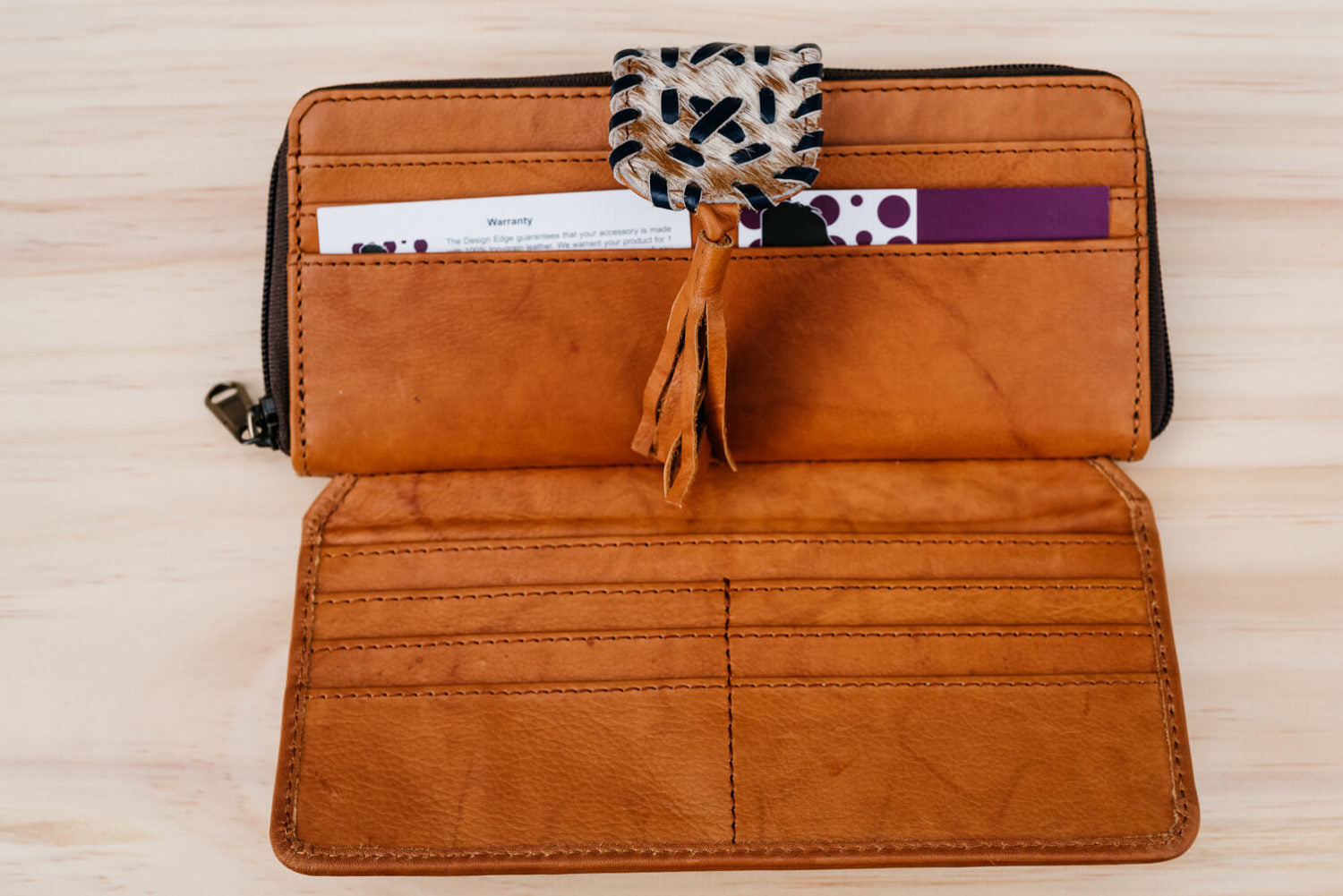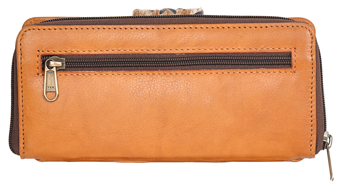 This sleek leather cowhide wallet is perfect for toting your necessities during an evening out. The zip-around silhouette opens to reveal two compartments with multiple card slots and a center pocket so you can easily access all of your essentials. The outer flap with hairon and boho chic look adds to the elegance of this piece.