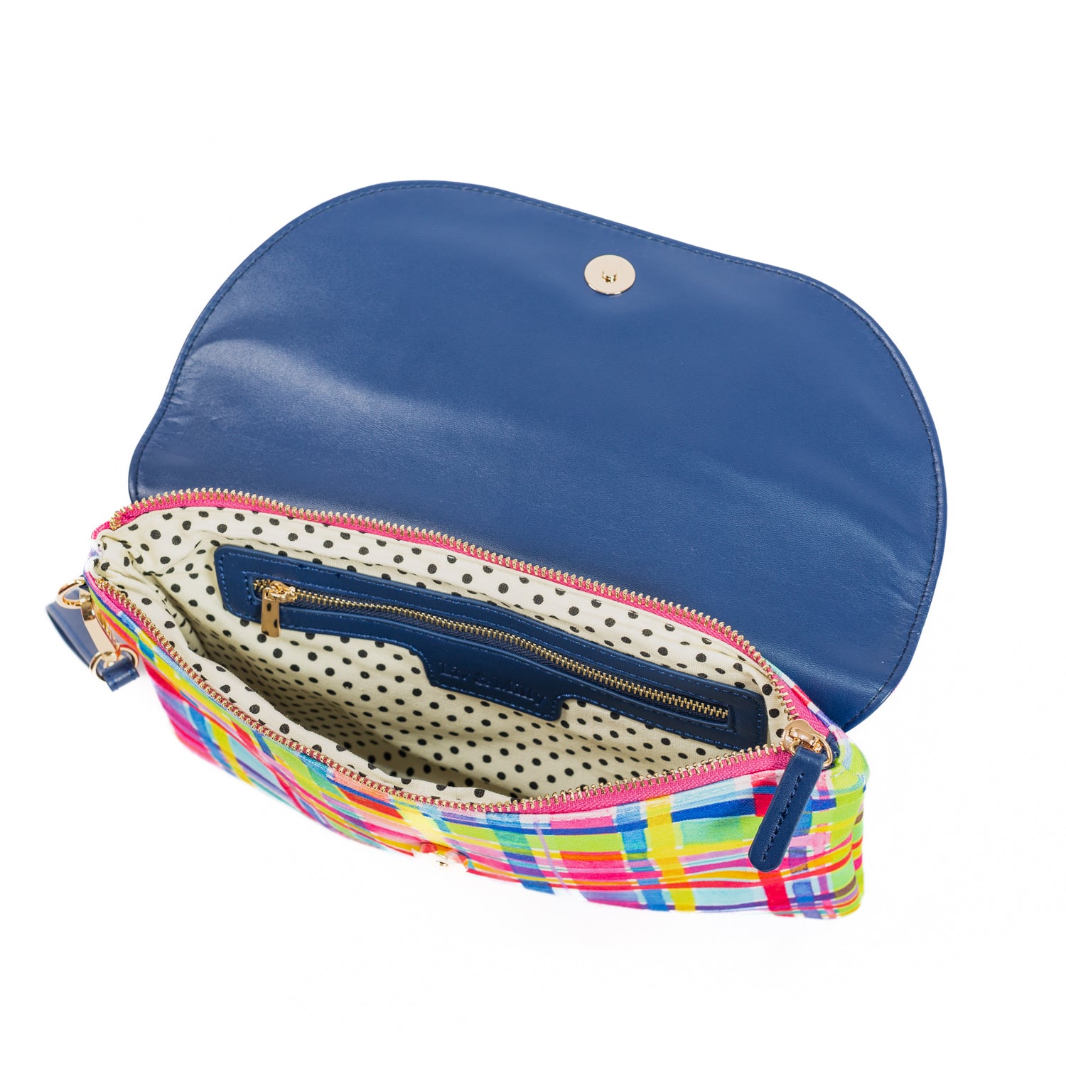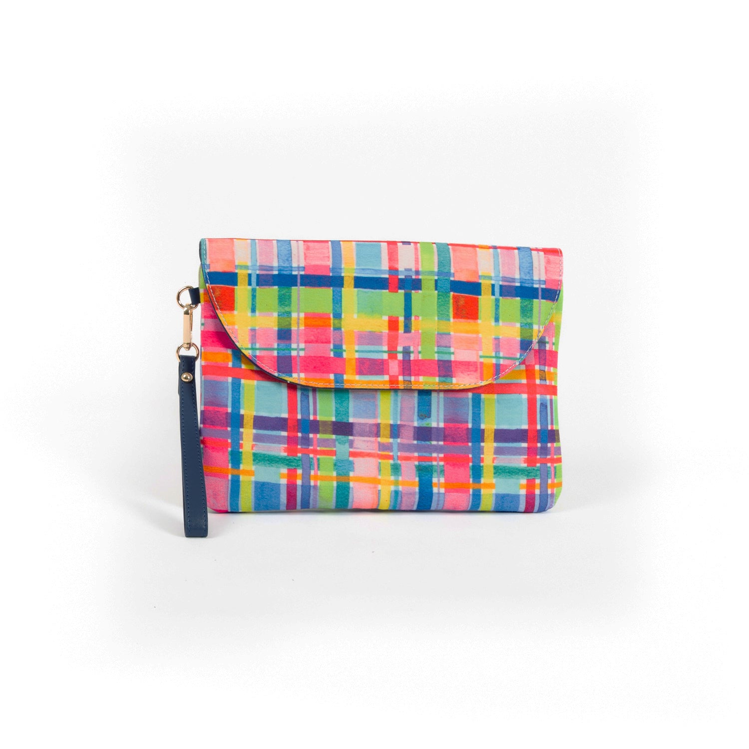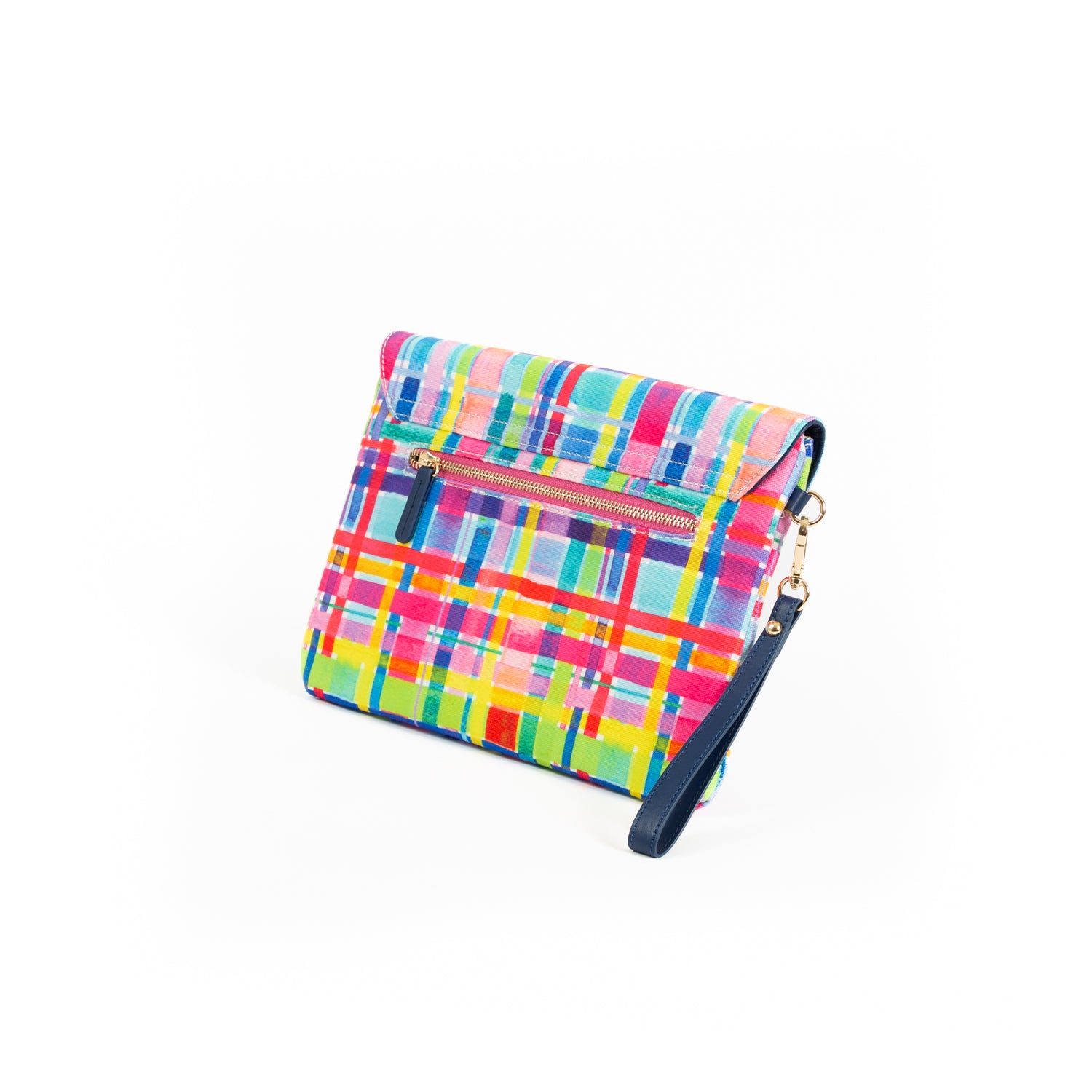 Internal Features: Zip pocket and a flat pocket External Features: Wristlet strap & external zip pocket Internal Lining: Cream & black spotted linen Closure: Secure zip & magnetic closure External Features: 'Rainbow Gingham' printed canvas Hardware: Gold Dimensions: H21cm x W29cm x D1cm Complimentary dust bag for storage