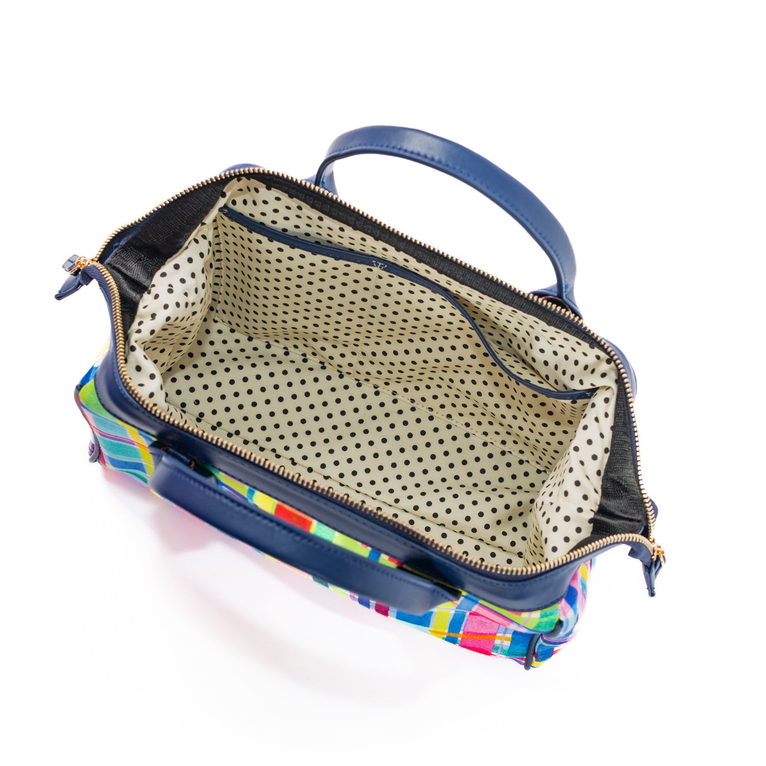 Internal Features: 1 x side zip pocket, 2 x flat pockets Internal Lining: cream & black spotted linen External features: Lordy Dordie 'Rainbow Gingham' artwork printed on canvas, Blue handles and strap Extension strap: removable & adjustable extension strap Hardware: Gold Closure: Dual zip Opening: wire frame, large opening like a bowls bag, 14cm Dimensions: W30cm H20cm D12.5cm Complimentary dust bag for storage