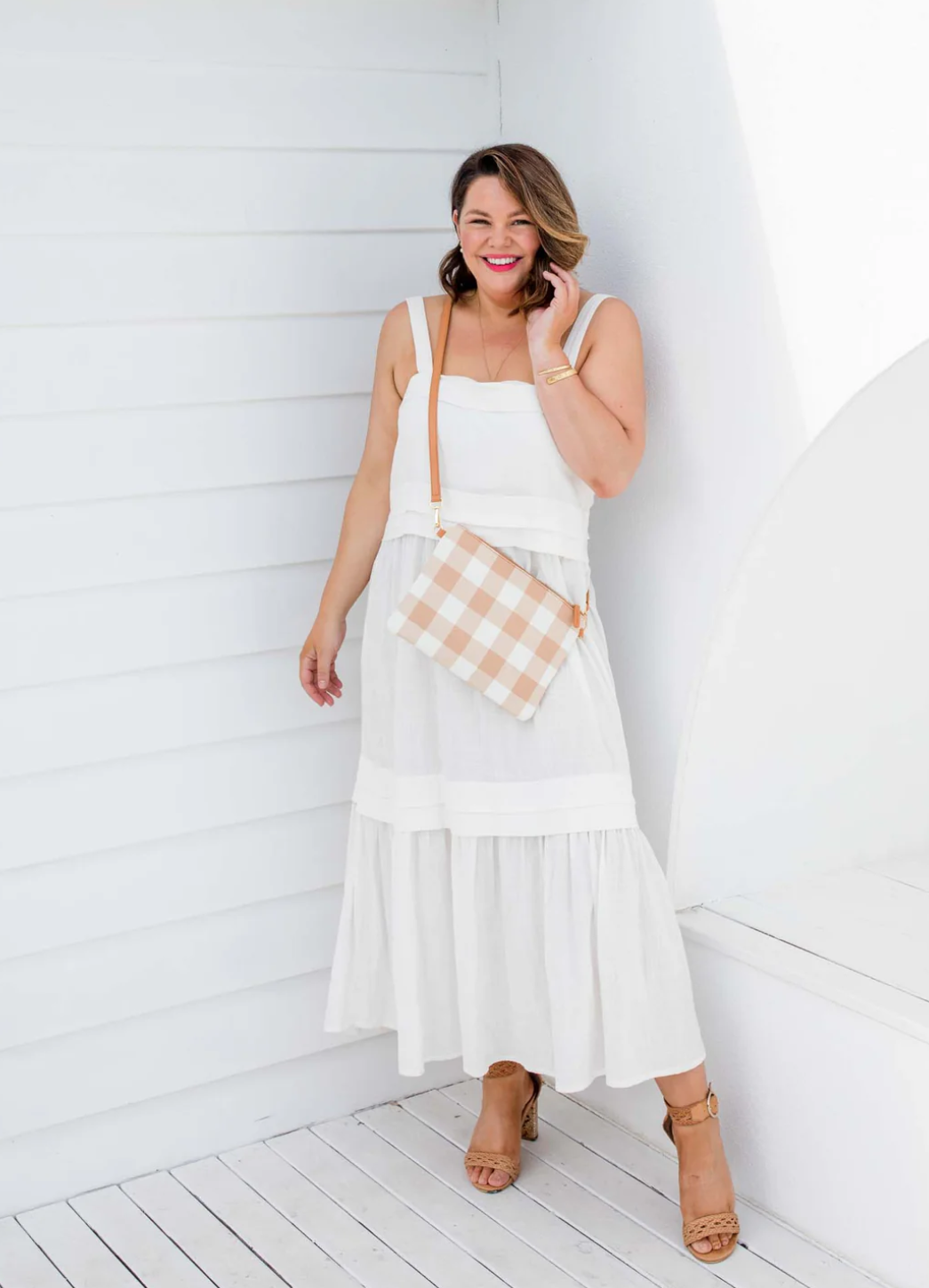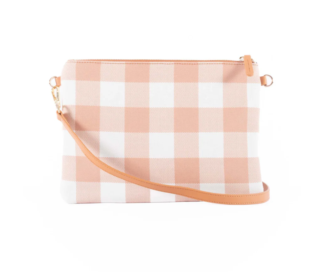 Functional and fun! Capri's signature gingham range has expanded from beautiful and practical totes to include a selection of bright and bold crossbody bags that come in 2 x sizes. This cute and fun large, latte & white gingham crossbody bag also has the option to be used as a wristlet.