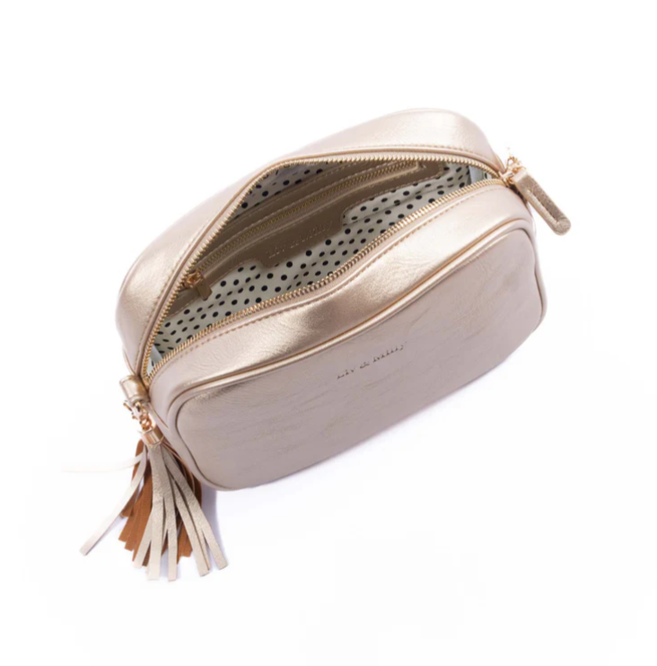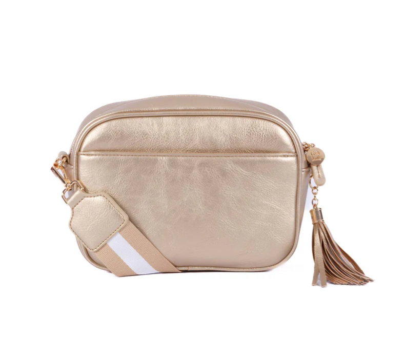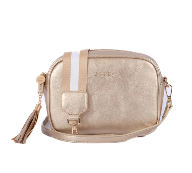 The Liv & Milly Sally in Gold is a classic & versatile crossbody bag crafted from a gorgeous soft vegan leather. The Sally comes with two adjustable straps, a guitar strap and matching tan strap. Perfect hands free bag to hold your phone and coffee whilst on the go.