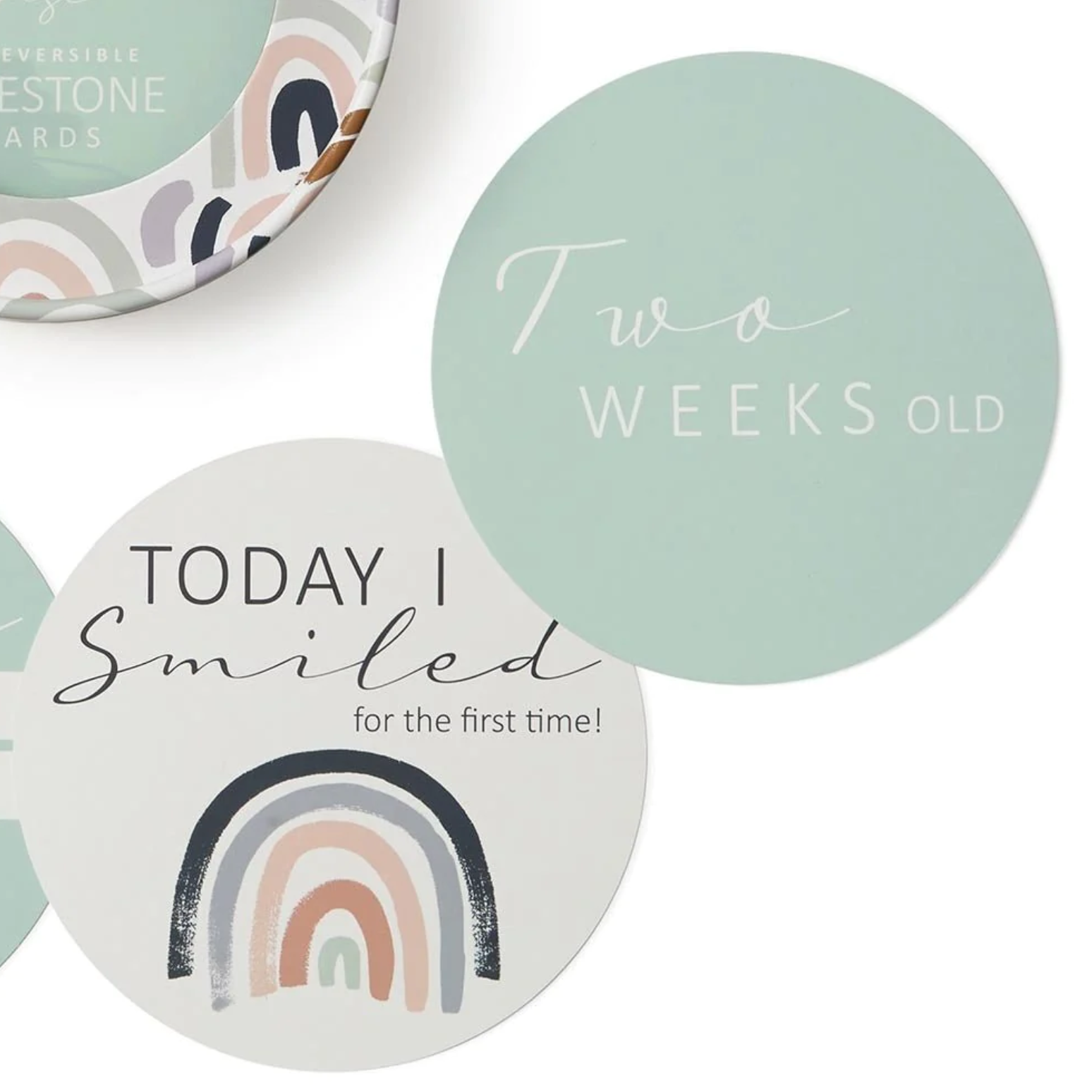 This 2 in 1 pack contains 25 Reversible milestone cards that coordinate with our Rainbow Baby organic wraps and clothes.