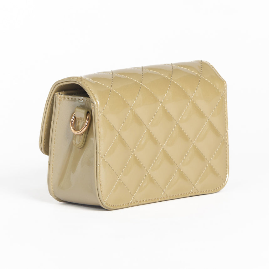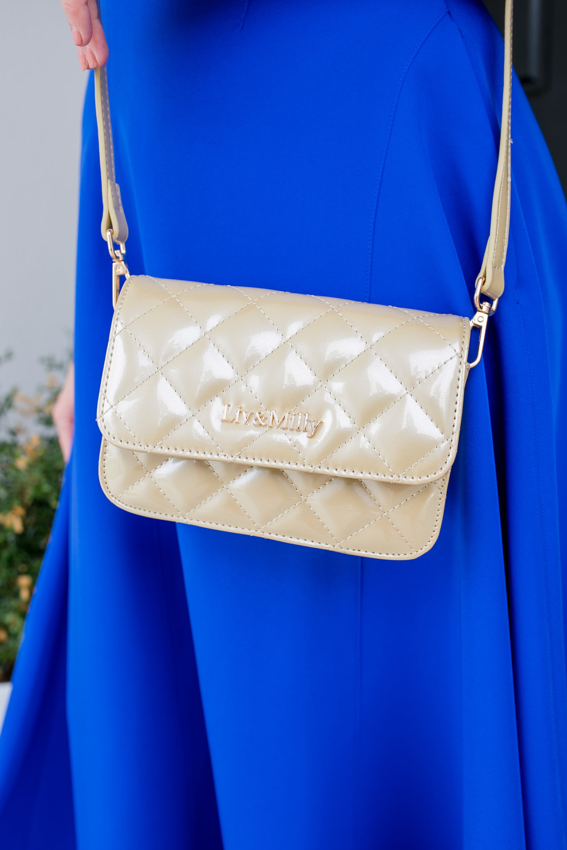 Colour - Blonde Internal Lining: Cream with black spotted linen External Material: Patent polyurethane (PU) - Vegan leather Hardware: Gold Dimensions: L18cm x W14cm x D6.5cm Complimentary satin dust bag for storage (to protect that glossy patent!)