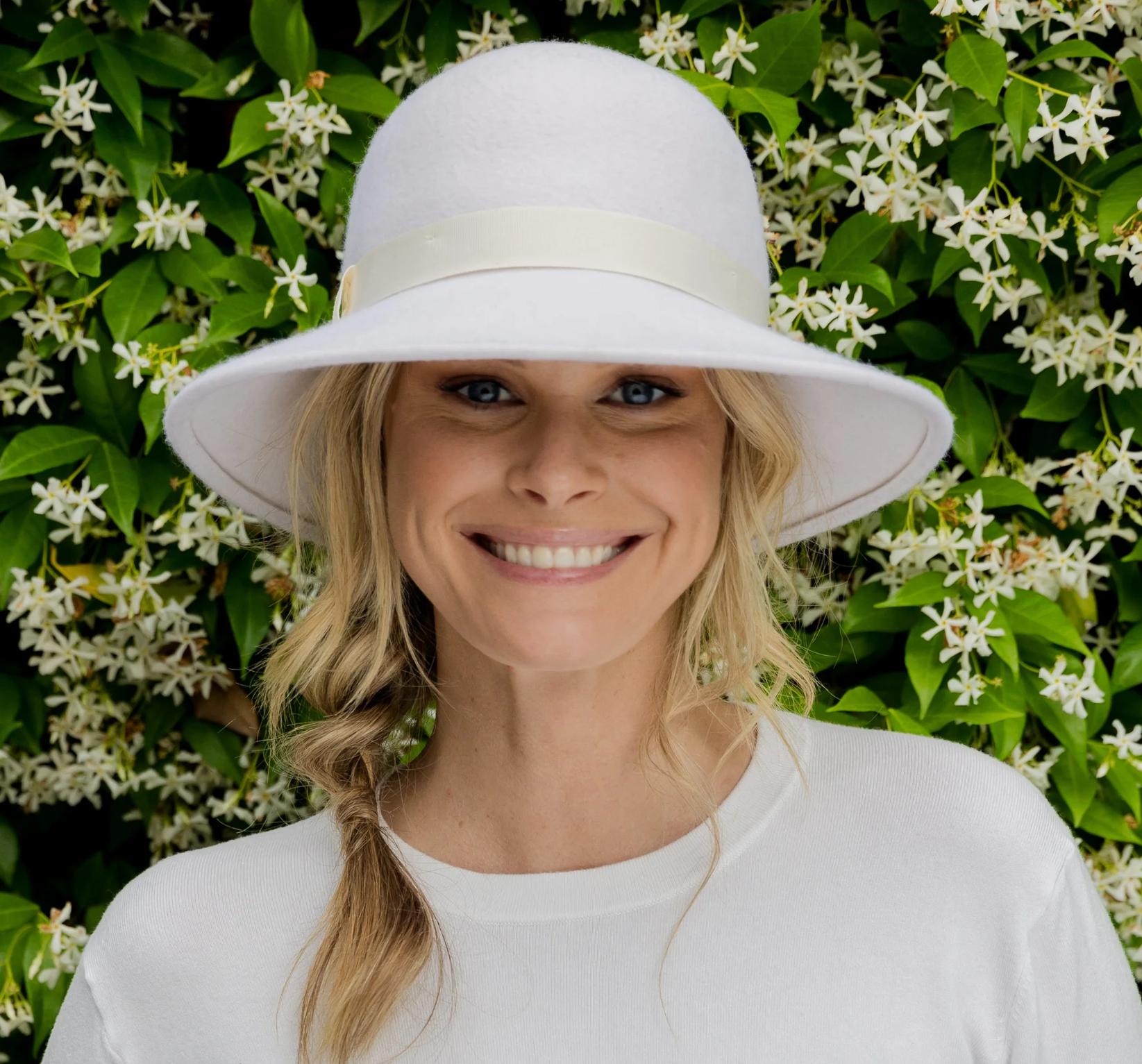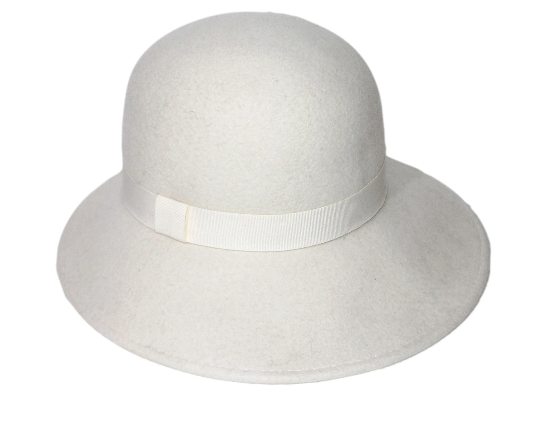 A sophisticated cloche style the Katrina is made from versatile wool felt and is complemented with a tonal grosgrain ribbon.