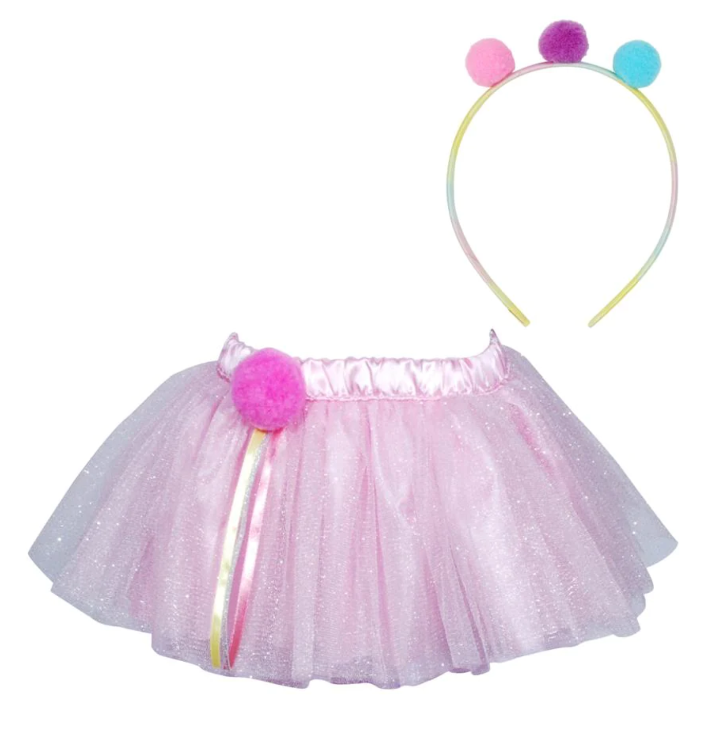 Dreamer Dancer Pale Pink Tutu & Headband Set is just tutu-cute! Includes an adorable mini multi-layered tutu and pom headband. Tutu consists of 2 soft mesh layers, then top with sparkling iridescent glitter & features a pom-pom on the waist with dangling pastel coloured ribbons. It is satin lined with a satin elasticised waistband. The pastel rainbow headband is tops with colourful pom-poms to match.