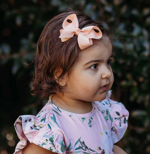 Our Snuggle Hunny Peach bow hair clip is beautiful and a great accessory to go with our organic dresses and clothing.