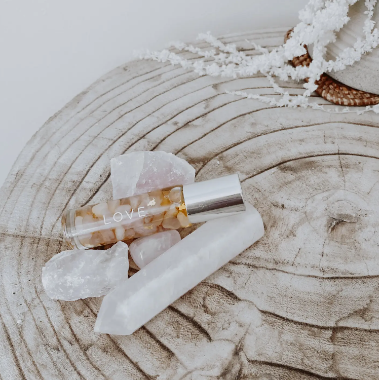 · I allow love to fill my body and soul. · Rose Quartz infused oil with a Rose Quartz rollerball to promote Love, Compassion, Kindness & Tenderness. This essential oil blend of Rose & Vanilla will encourage self-love as well as the love you have for others. Directions: Apply to the wrists, temples and behind the ears to encourage love to flow. Ingredients: Fractionated Coconut Oil, Jojoba Oil, Rose & Vanilla Essential Oils, 24k Gold. Please note: Our rollers are created using Essential Oils, they do not contain any fragrance oils and are not designed as perfume.