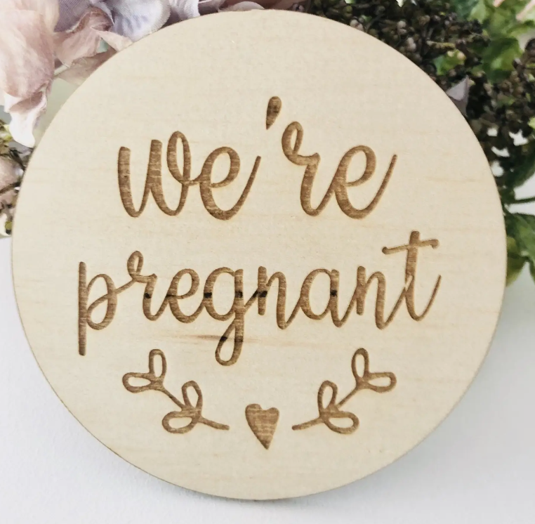 This birth announcement disc is laser carved on a quality 3mm wooden disc with "were pregnant" etched with botanical details.